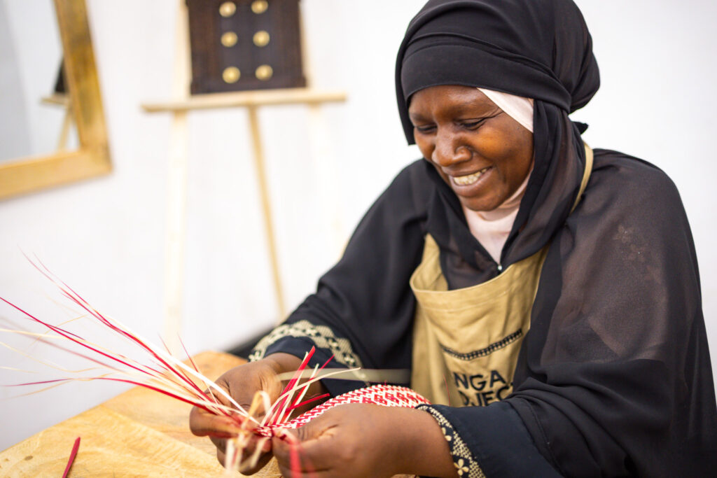 The workshop is home to eight core artists representing broader collectives: twenty women who’ve reignited their passion for weaving bags after the tradition nearly vanished, ceramicists working together to preserve ancient techniques. Through charitable work, Muna travels deep into Zanzibari communities, re-discovering artisanal practices she remembers from childhood. “These are elements of home,” she explains, pieces of an intangible heritage slipping away as Stone Town’s soaring prices push artists far from the historic centre.